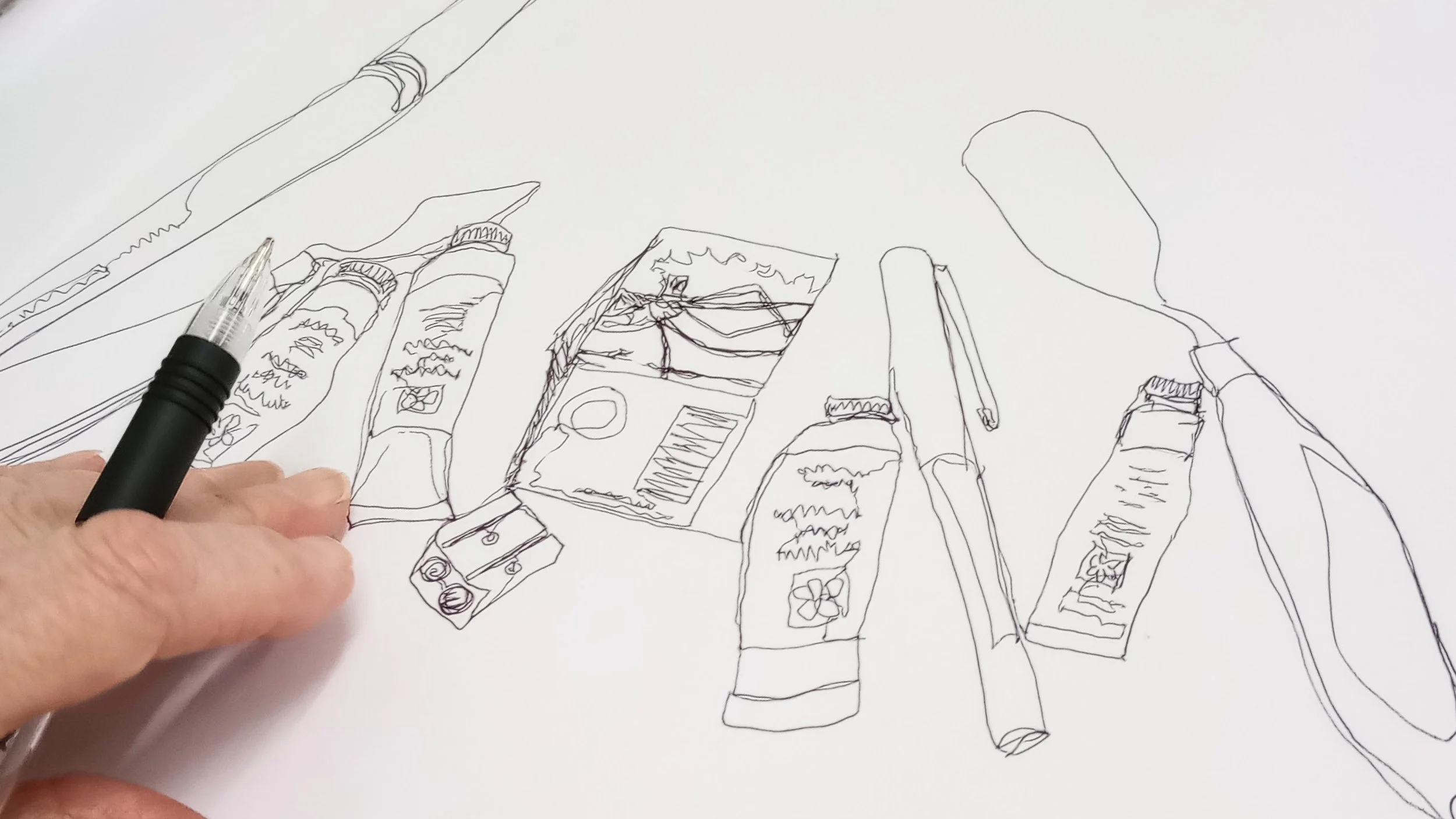 Example of continuous line drawing of art materials by Cathy Badley, at an Art Club session 2024